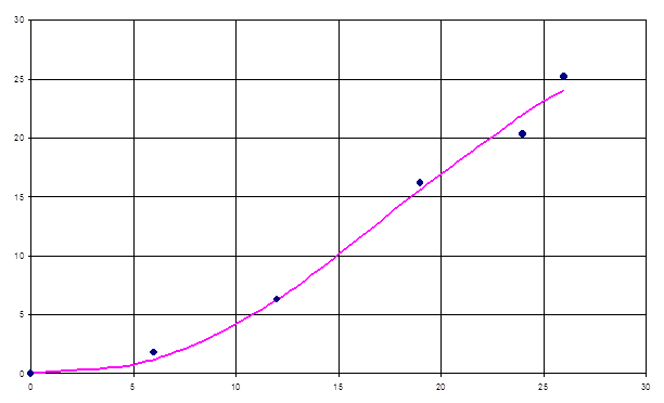 aP, bP были определены методом наименьших квадратов: aP=13.27, bP=1.249, сумма квадратов отклонений QP составила 0,884, а средняя квадратичная ошибка SP равна ± 0.6648.